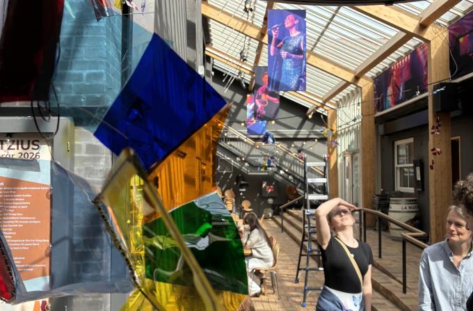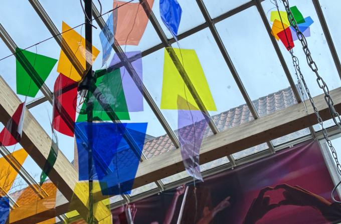 Eleverne har fundet inspiration i farverne og formerne i Mantzius’ nye visuelle identitet og brugt gamle lysfolier til scenelamper som materiale.